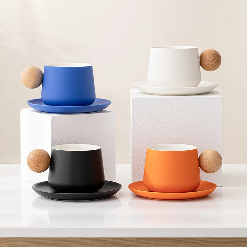 Ceramic Coffee Cup and Saucer Set Espresso Cups Light Luxury Wooden Handle Afternoon Tea Mug Female Original Mugs Couple Gifts
